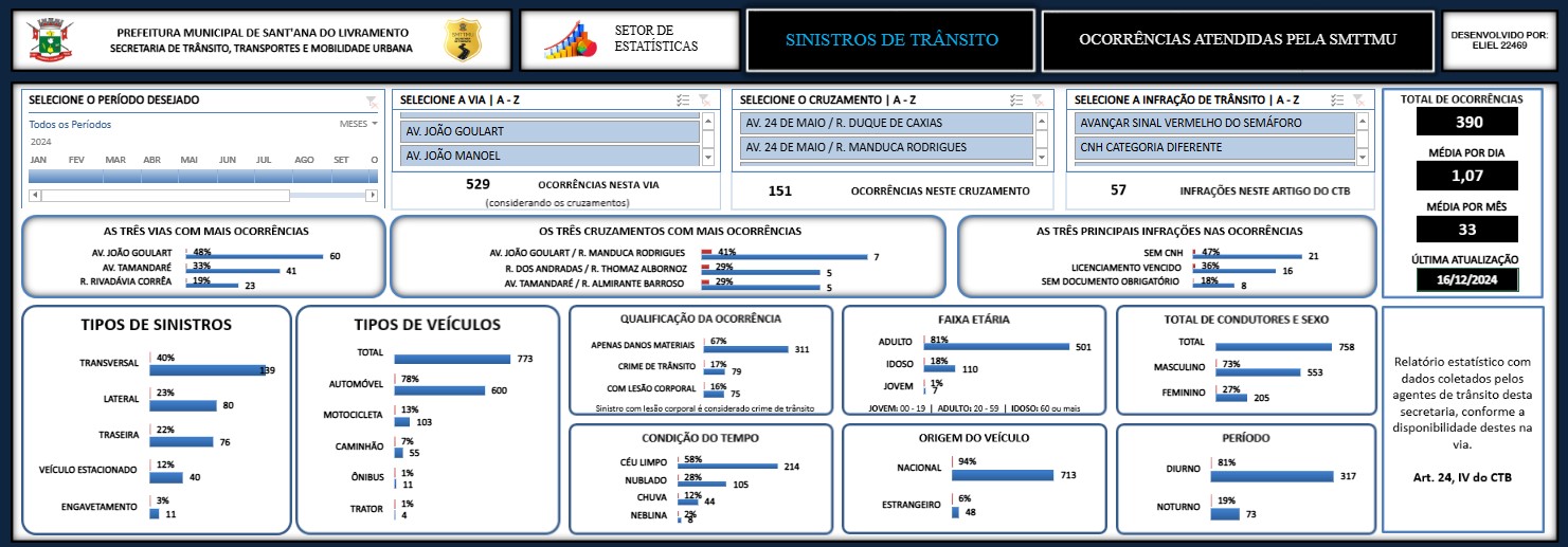 Dados da Secretaria de Trânsito, Transportes e Mobilidade Urbana de Sant’Ana do Livramento (SMTTMU) indicam que o município contabilizou 390 ocorrências de acidentes de trânsito até o dia 16 de dezembro de 2024. A média diária de ocorrências é de 1,07 e a média mensal é de 33.