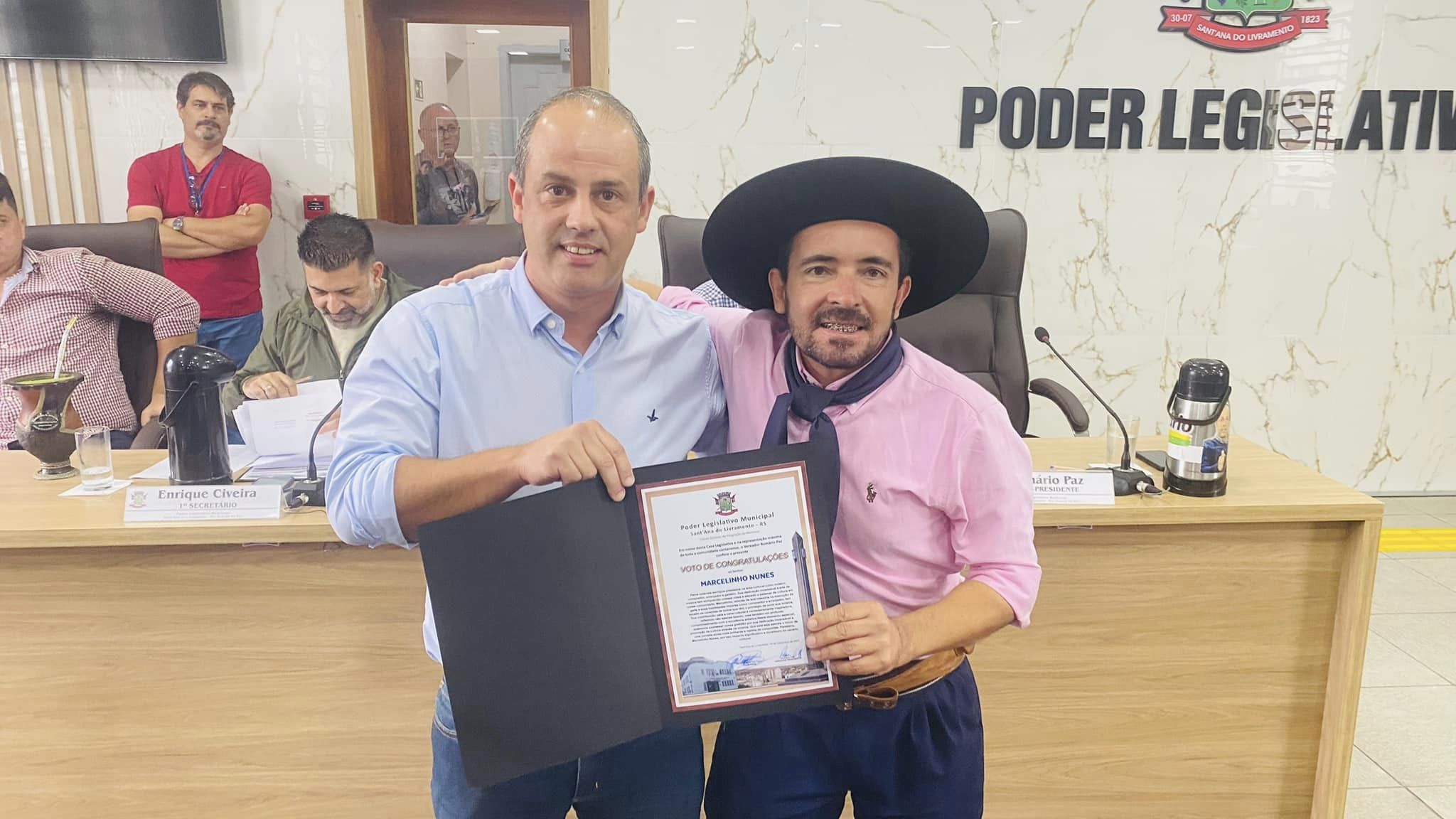 Na oportunidade, o músico, compositor, arranjador e acordeonista, Marcelo Nunes, recebeu o voto de congratulação por sua dedicação, esforço e trajetória no cenário musical gaúcho. Nascido em 28 de janeiro de 1976, natural de Sant’Ana do Livramento, é músico, compositor e arranjador, começou a tocar sua cordeona em 1989, tendo como professor o músico Leonel Gomez. Este voto foi uma proposição do Vereador Romário Paz, e aprovado unanimemente.