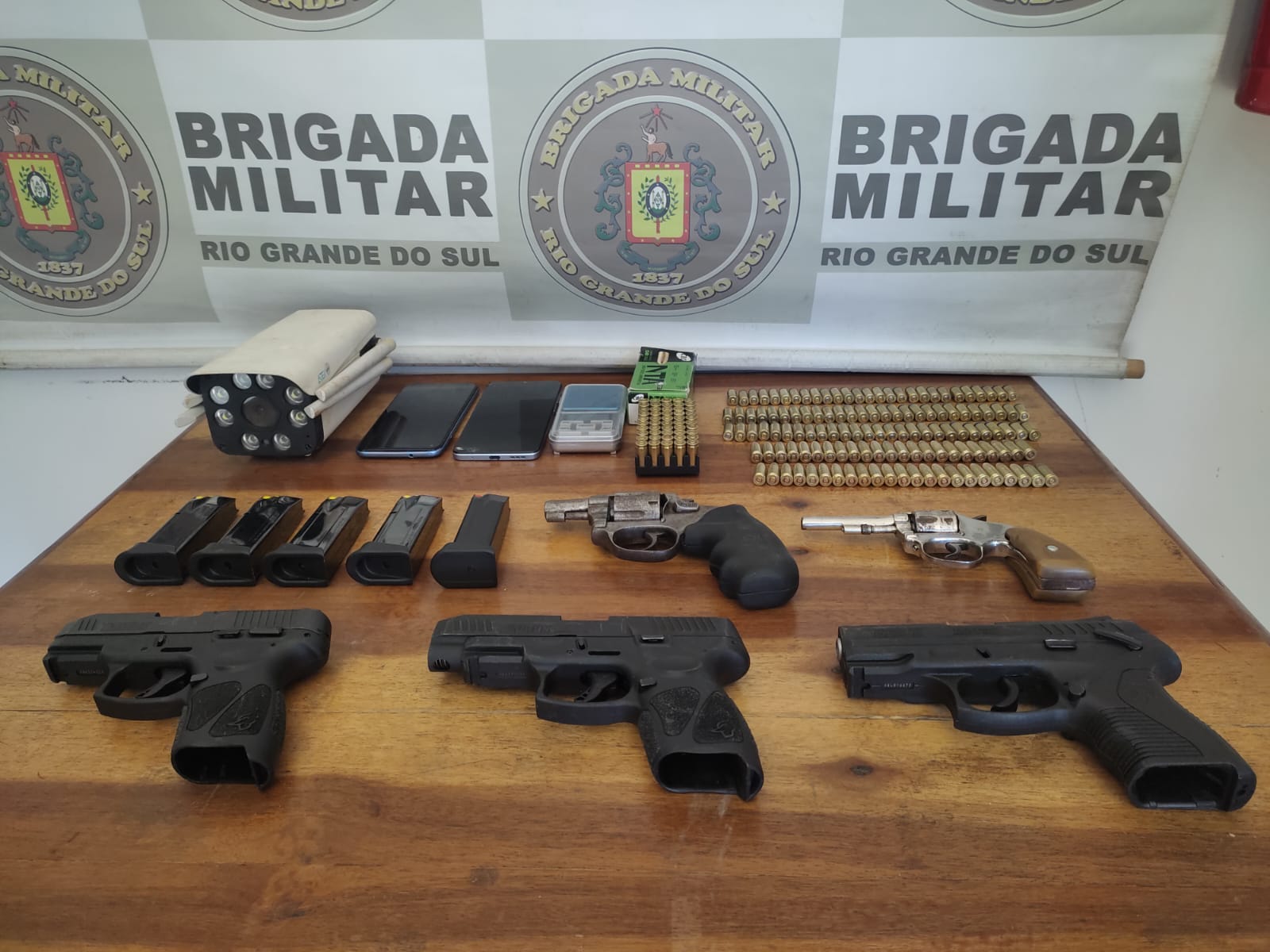 Ao chegarem à residência, os policiais encontraram um verdadeiro arsenal. Foram apreendidas três pistolas – duas delas de calibre 9mm, de uso restrito, e uma calibre 380 –, além de dois revólveres, um de calibre 38 e outro de calibre 32. Além das armas, uma grande quantidade de munições foi localizada, além de celulares e câmeras de segurança, indicando uma possível estrutura de vigilância na residência.