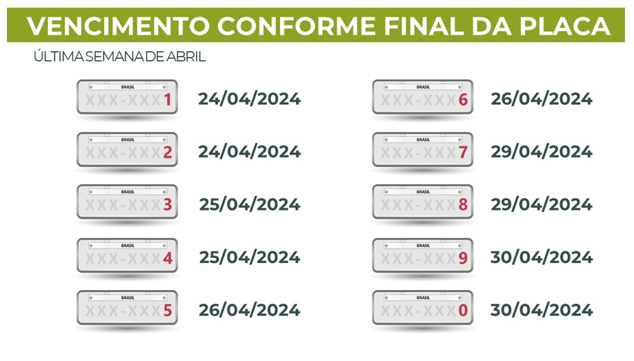 O vencimento do imposto ocorre a partir da última semana de abril, conforme cronograma estabelecido pela Receita Estadual. O contribuinte que pagar o imposto no próximo mês não terá o desconto de antecipação, mas recebe as reduções do Bom Motorista e do Bom Cidadão até a data de vencimento da placa, caso tenha direito aos benefícios.