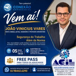 A Associação Comercial e Industrial de Livramento (ACIL) promove, no próximo dia 5 de maio, a palestra “Segurança do Trabalho Além da Norma”, com o perito criminal, engenheiro e professor universitário João Vinicius Vares. O evento, que integra o programa Conexão Empresarial, será realizado às 19h30 no auditório da entidade e tem como objetivo discutir a gestão de risco e responsabilidade no ambiente corporativo.