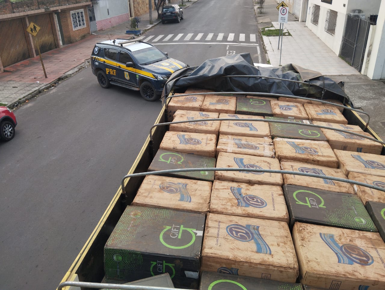 O caminhão, com placas de Duque de Caxias/RJ, também foi abordado pelos policiais e verificado que estava totalmente carregado com 125 mil maços de cigarros contrabandeados de origem estrangeira.