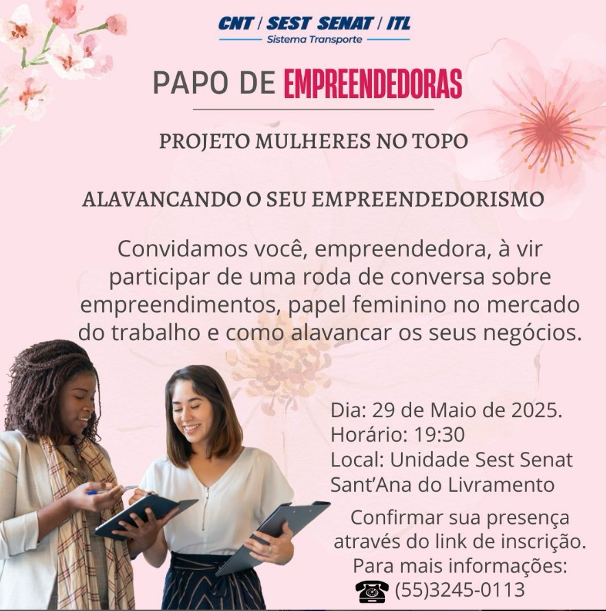O Serviço Social do Transporte e o Serviço Nacional de Aprendizagem do Transporte (Sest Senat) realizam, no próximo dia 29 de maio, em Sant’Ana do Livramento (RS), uma roda de conversa voltada ao empreendedorismo feminino. A atividade integra o projeto “Mulheres no Topo” e será realizada na unidade local da instituição, com início previsto para as 19h30.